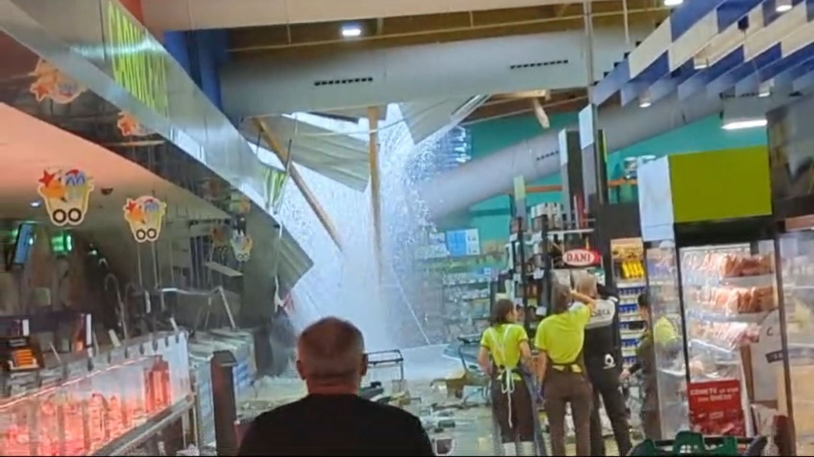 Una de las imágenes que van a quedar grabadas para siempre de este martes y 13 de agosto de 2024 es la del establecimiento Family Cash. El viento y el agua han provocado el colapso de parte del techo de uno de los supermercados de referencia de la localidad. Por suerte no ha habido que lamentar heridos. Hasta el lugar se han desplazado miembros del cuerpo de bomberos de Ontinyent y el sargento de Alzira, así como la Policía Local y la Policía Nacional.