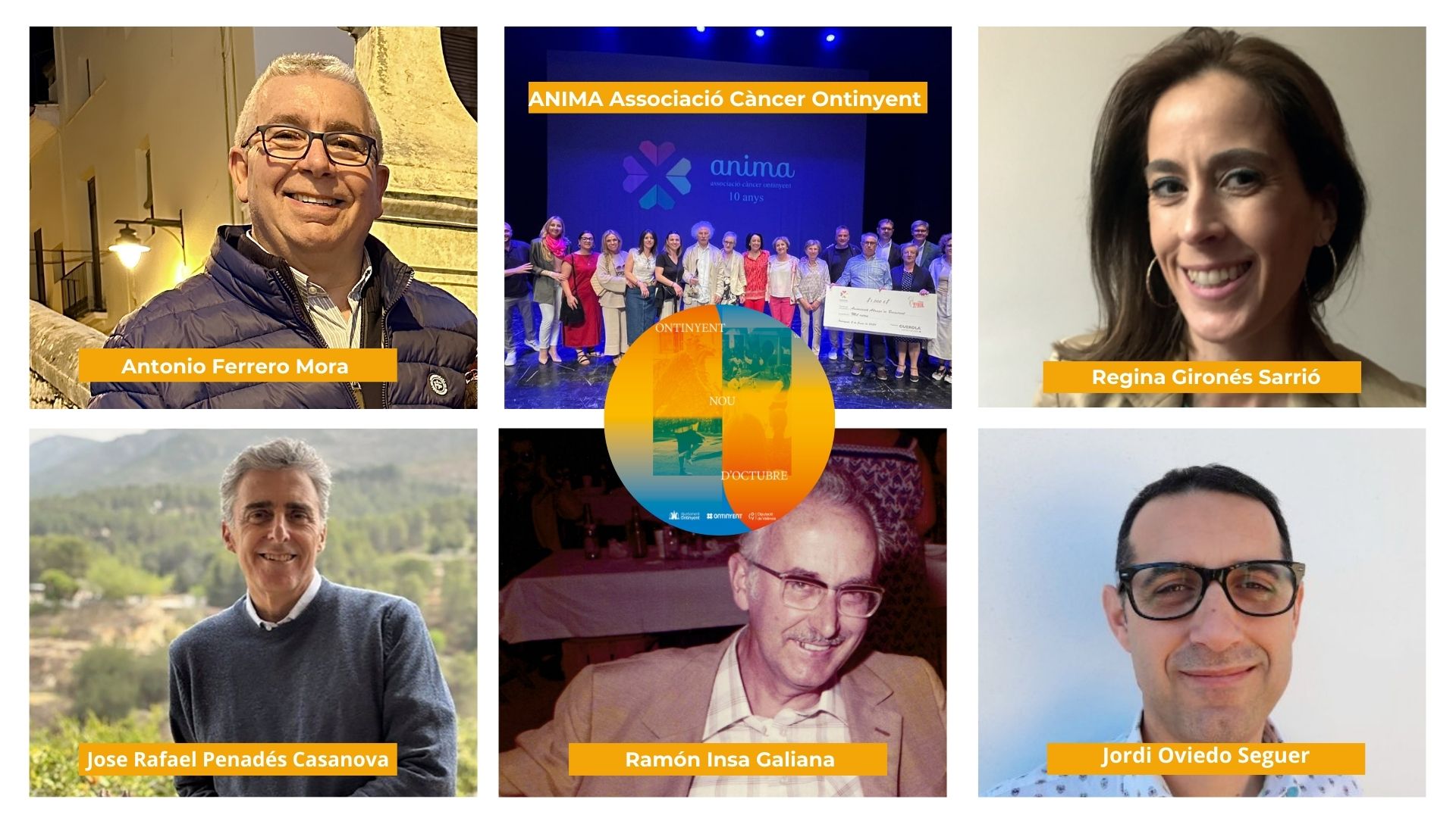 La asociación ontiñentina de apoyo a personas enfermas de cáncer ANIMA; Jordi Oviedo; el científico José Rafael Penadés Casanova; la oncóloga Regina Gironés; el artista y profesor Ramón Insa (a título póstumo) y el jefe de alguaciles del Ayuntamiento de Ontinyent Antonio Ferrero Mora son las personas y entidades que el Ayuntamiento de Ontinyent reconocerá este año a los premios “9 de octubre” por su tarea en beneficio de la sociedad a diferentes ámbitos, tal como se ha acordado hoy por consenso del alcalde y todos los grupos políticos representados en el Ayuntamiento. El Alcalde de Ontinyent, Jorge Rodríguez, comunicaba el reconocimiento a todas y todos los galardonados, felicitándolos “por su tarea y dedicación a sus diferentes ámbitos, que los ha hecho ser merecedoras y merecedores de esta distinción”.