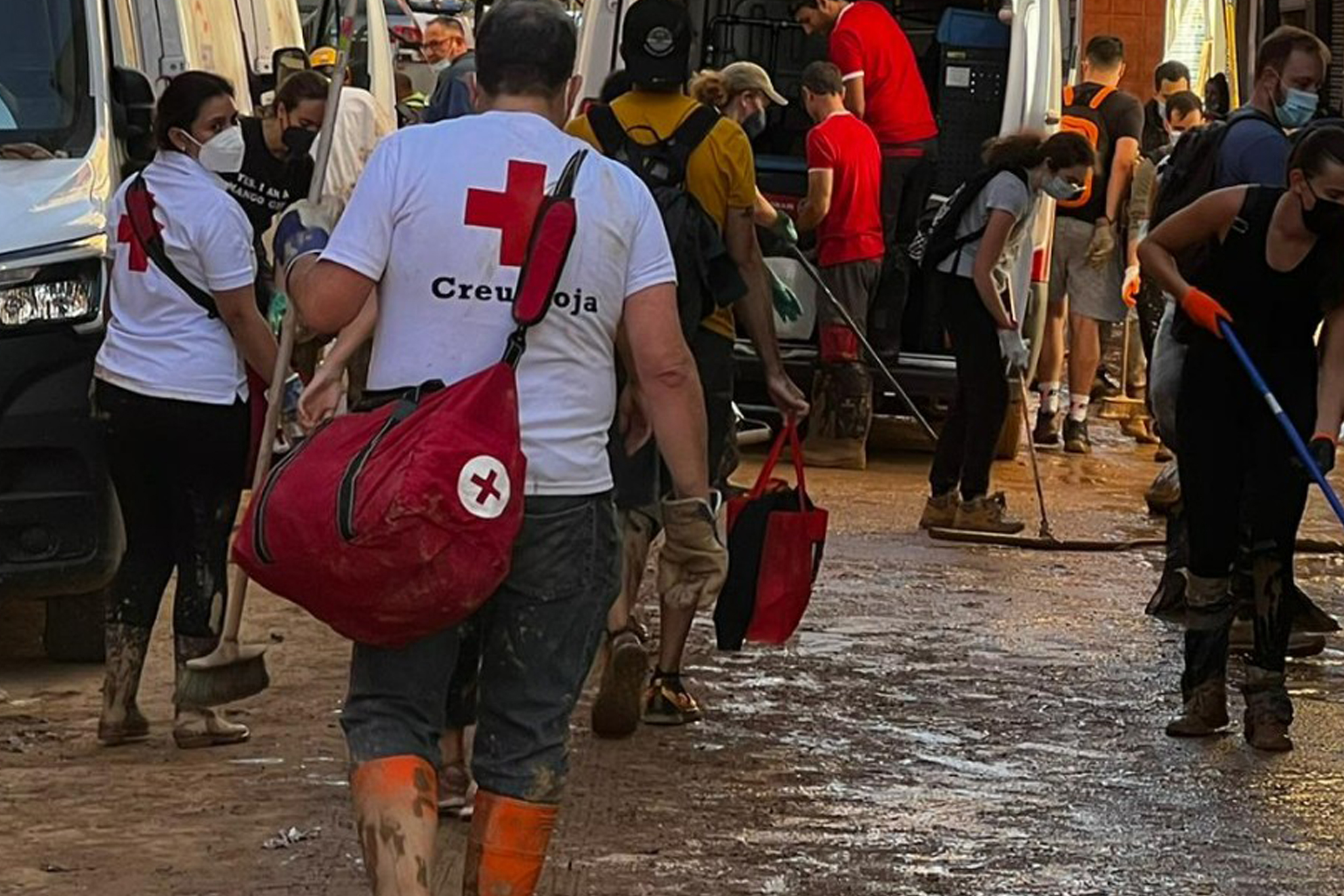 Desde el primer momento Cruz Roja Ontinyent está aportando su todoterreno para poder circular por la localidad y también las manos de los voluntarios que ayudan a descargar camiones, organizar lotes y repartir todo lo necesario en coordinación con el ayuntamiento de Algemesí.